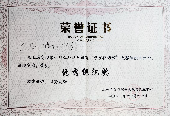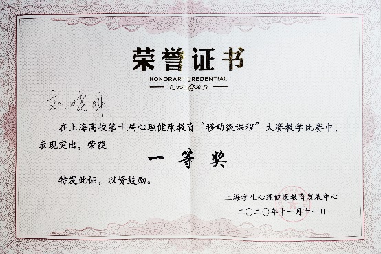 材料工程学院刘晓明老师荣获第十届上海高校心理健康教育“移动微课程”大赛一等奖,我校获得优秀组织奖