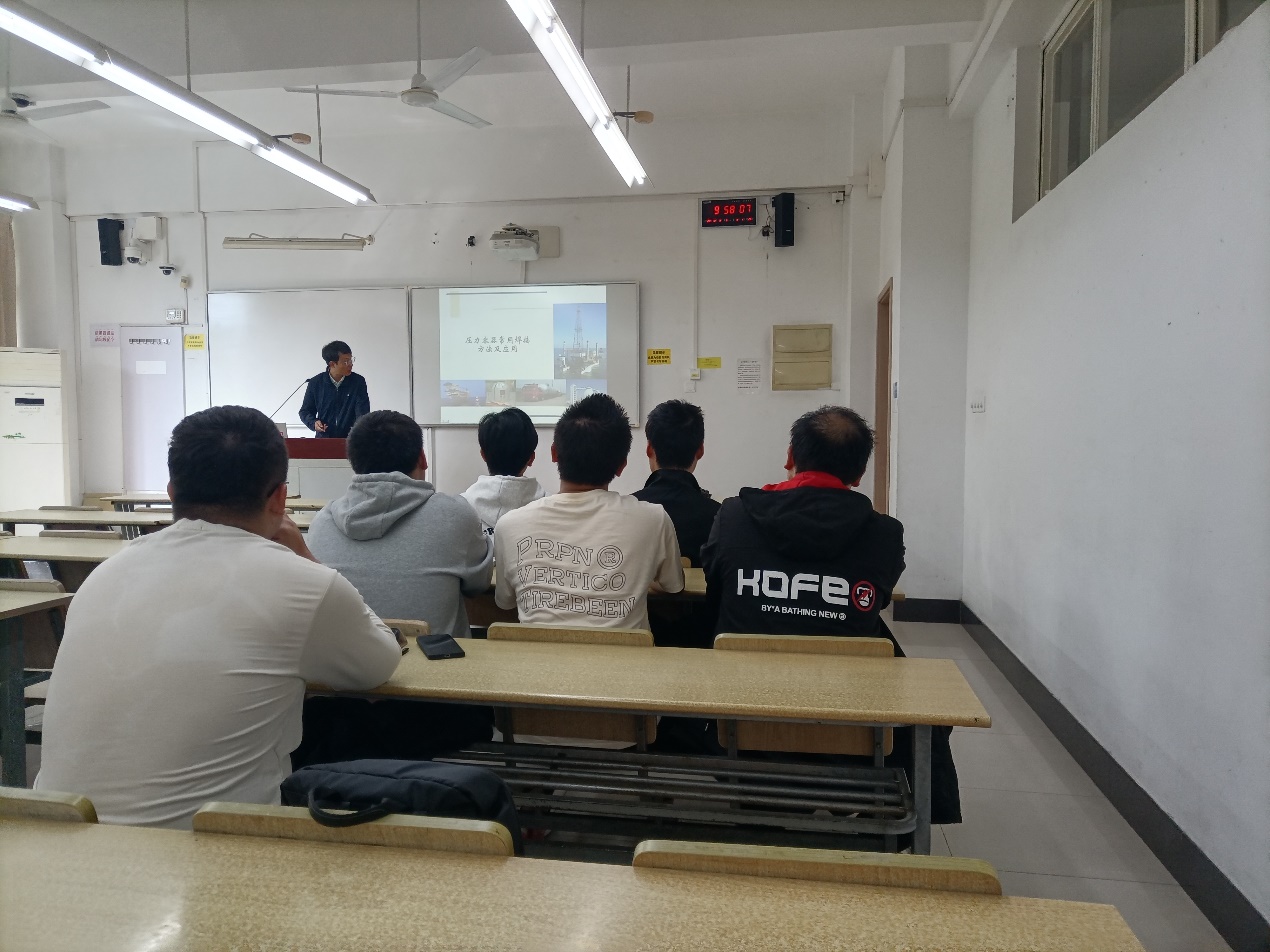 在讲座过程中,陈晶工程师给同学们讲述了焊接方法特点,运用焊接过程的录像,详细分析了各种焊接方法在压力容器制造过程中的应用,把课堂上的理论基础知识与工作实际相结合。同时,陈工艺师还分享了毕业生如何顺利适应企业生产与生活的经验。在讲座过程中,陈工艺师妙语连珠,慷慨激昂,同学们也热情高涨,频频爆发出热烈掌声。