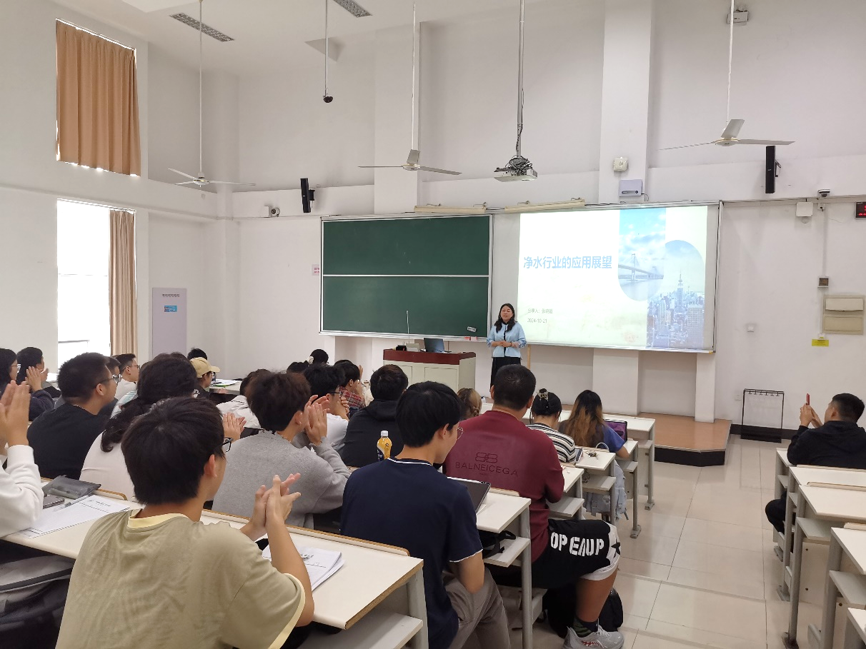 随后,张总还介绍了净水行业的应用场景及展望。从家庭饮用水处理到工业废水净化,净水技术的应用范围广泛,市场前景可观。最后,张总结合自身的经验,为同学们讲解了校园知识如何运用到未来工作中。她鼓励同学们扎实学习专业知识,培养创新思维和实践能力,为将来投身材料科学与工程领域做好准备。