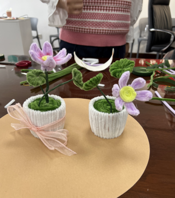 在花艺师的热情引导下,活动正式拉开帷幕。花艺讲师们从专业角度给大家讲解了制作工具和使用方法,详细介绍了扭扭棒的基本制作方法,从如何弯曲、扭转扭扭棒以塑造出不同的形状,到怎样巧妙地将各个部件组合在一起,并介绍了盆栽创作的制作方法和注意事项。老师们全神贯注地聆听着,眼睛紧紧地盯着老师的示范,生怕错过任何一个关键的细节。在花艺师们的指导下老师们首先从最简单的花盆开始做起,逐渐到荷叶,花朵和花苞,有的老师在基础花型上还进行了再创造,制作出了精美的盆栽。看到自己亲手制作的花朵,大家疲惫的身心瞬间被治愈;有的老师还主动承担起助教的角色,帮助其他老师进行制作,增进了同事之间的交流与协作,增强了团队的凝聚力。