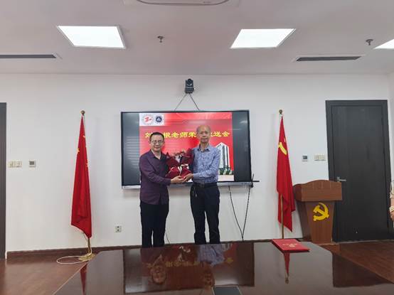 仪式现场温馨简约、其乐融融。胡书记向老师们介绍了刘传根老师在材料学院的工作经历和业绩,代表学院对刘教师在岗位上的辛勤付出、无私奉献和所做的贡献表示由衷的感谢和崇高的敬意,期望刘教师继续关注和支持学院发展,积极为学院发展建言献策。