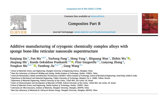 近日,必威betway西汉姆马盼教授联合上海大学贾延东研究员、穆永坤副研究员指导研究生谢凯强、方亚成在中科院一区期刊《Composites Part B: Engineering》(2025,306: 112786,IF=14.2)上发表了题为“Additive manufacturing of cryogenic chemically complex alloys with sponge bone-like reticular nanoscale superstructure”的研究论文。