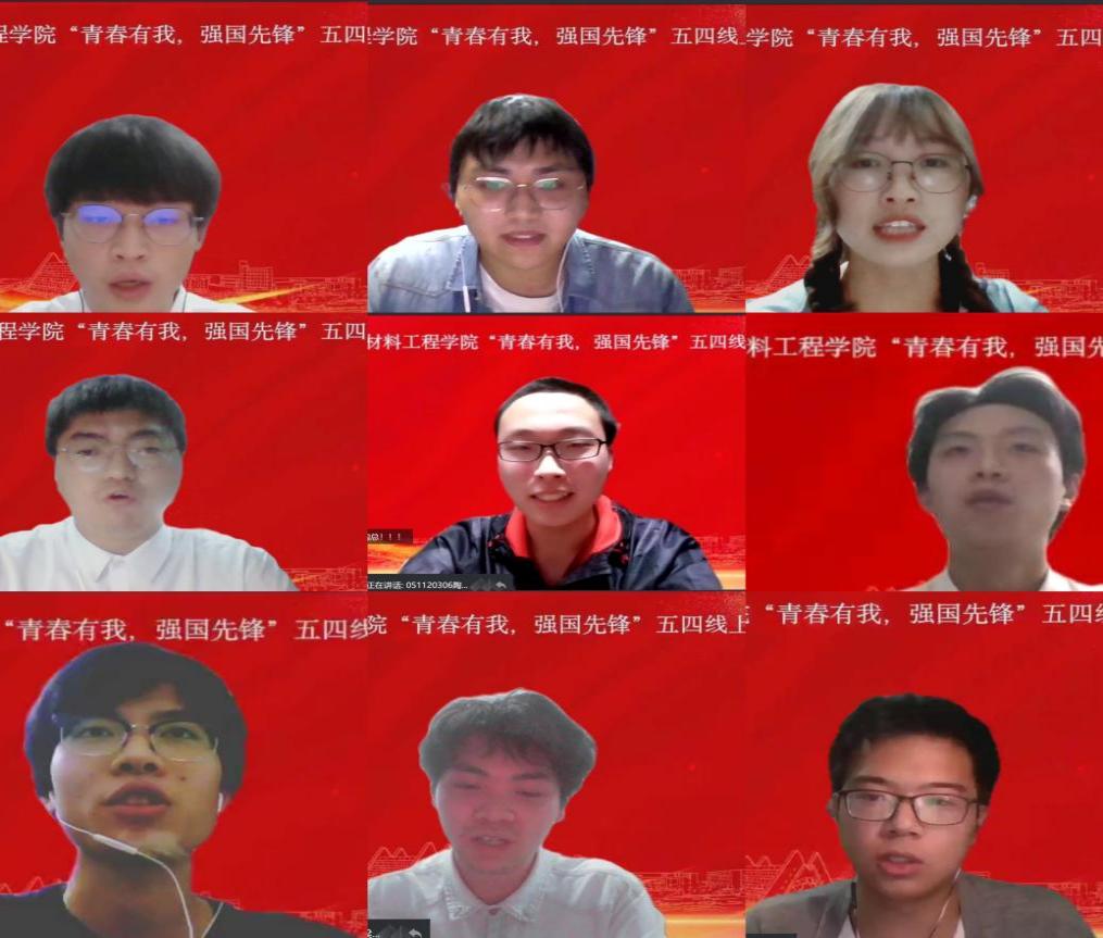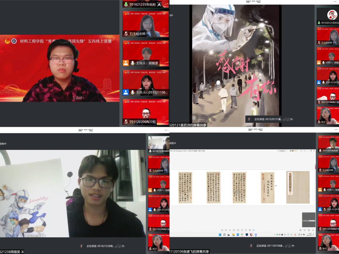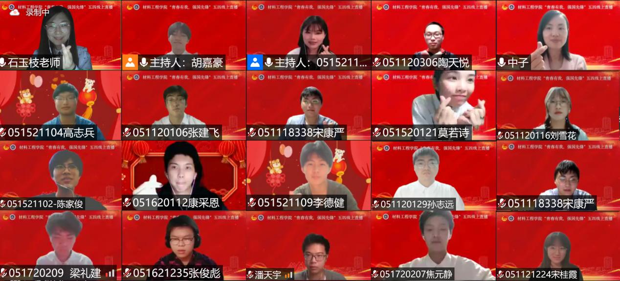 今年是中国共产主义青年团成立100周年,5月4日,材料工程学院团委于腾讯会议举办“强国先锋,青春有我”庆祝建团100周年线上直播活动。学院党委副书记黄中子老师、院团委书记石玉枝老师与全院320余名团员青年一起共度节日。活动由院团委组织部郭胤君和胡家豪同学主持。