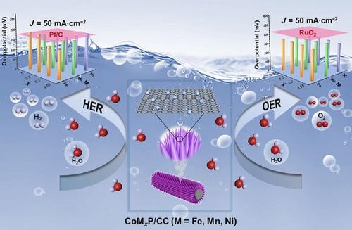 DFT辅助设计CoMxP/CC(M=Fe,Mn和Ni)用于宽pH范围析氢析氧的高效电催化剂