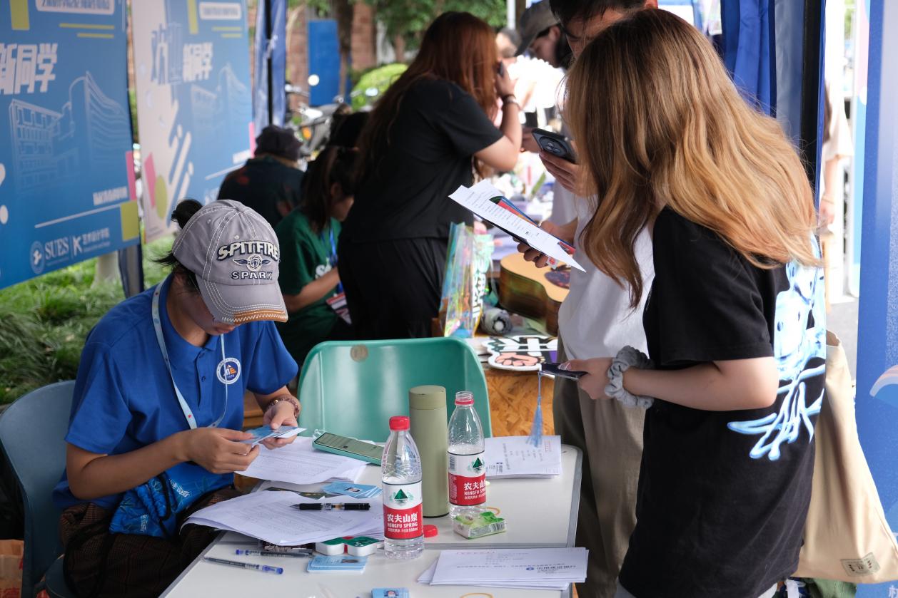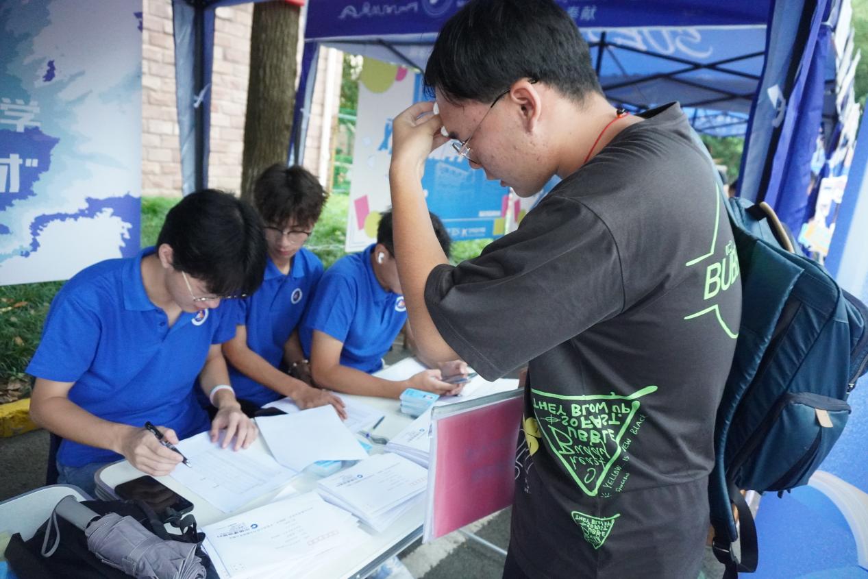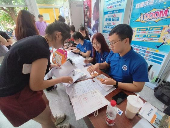 迎新现场,学长学姐按班级为新生们提供报到服务,领校园卡、银行卡,发放学院为同学们定制的礼物,跨越山海,我们终于相遇。